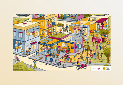 Ein neues Wimmelbild stellt anschaulich und farbenfroh die vielfältigen Angebote der Frühen Hilfen dar: Als Plakat zum Aufhängen und als Karte zum Mitgeben für Eltern.