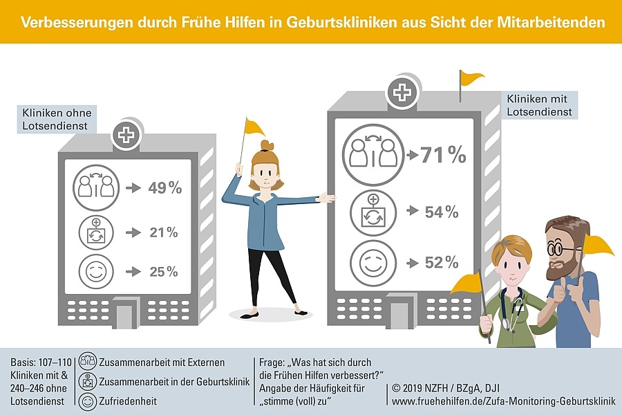 - So stellten 76 Prozent der Geburtskliniken mit Lotsendiensten Kontakt zu Familienhebammen oder Familien-Gesundheits- und Kinderkrankenpflegenden her; 59 Prozent der Geburtskliniken ohne Lotsendienst.