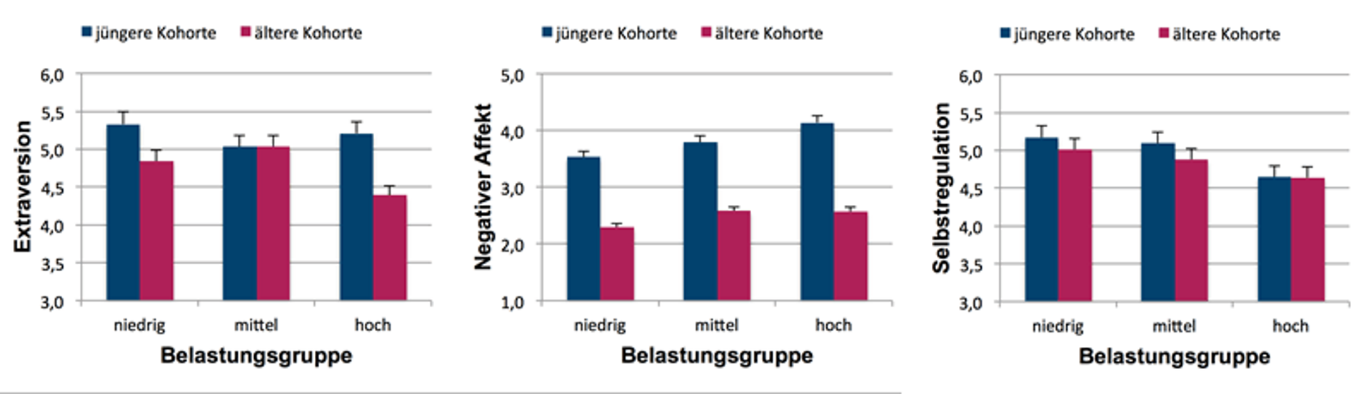 Das Temperament der Kinder wurde ebenfalls mit drei Skalen erfasst: Extraversion, negativer Affekt und Selbstregulation. Es zeigten sich Effekte familiärer Belastung auf das Temperament. Kinder aus wenig belasteten Familien wiesen weniger negative Affektivität auf als Kinder aus mittel und hoch belasteten Familien. Es reicht also ein mittleres Ausmaß von Belastung, um die emotionale Befindlichkeit der Kinder zu beeinträchtigen. Bezüglich Selbstregulation und Extraversion wurden Beeinträchtigungen erst bei hoher Belastung festgestellt. (s. Abb. 2)