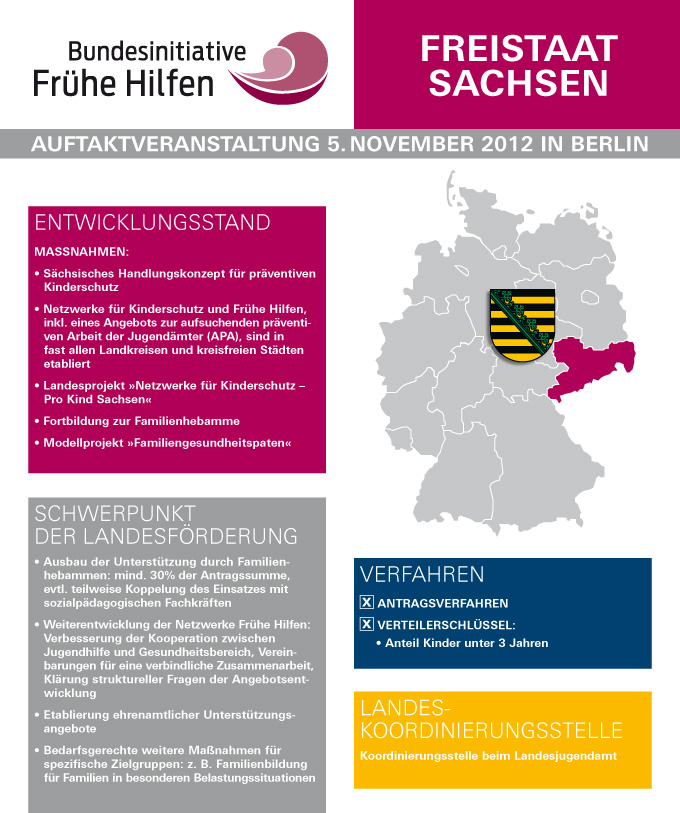 Anlässlich der Auftaktveranstaltung zur Bundesinitiative Frühe Hilfen im November 2012 haben die Bundesländer jeweils die Kernpunkte – wie Entwicklungsstand und Schwerpunkt der Landesförderung – auf Plakaten zusammengestellt.