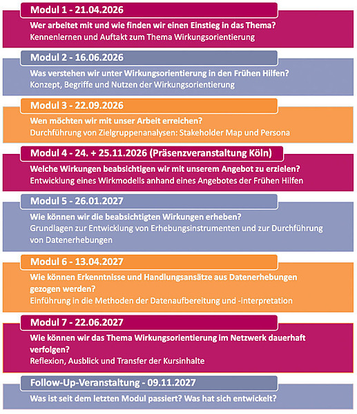 | Modul 2 | Was verstehen wir unter Wirkungsorientierung in den Frühen Hilfen? | 16. Juni 2026 (online) |