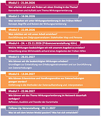 | Modul 5 | Wie können wir die beabsichtigten Wirkungen erheben? | 26. Januar 2027 (online) |
