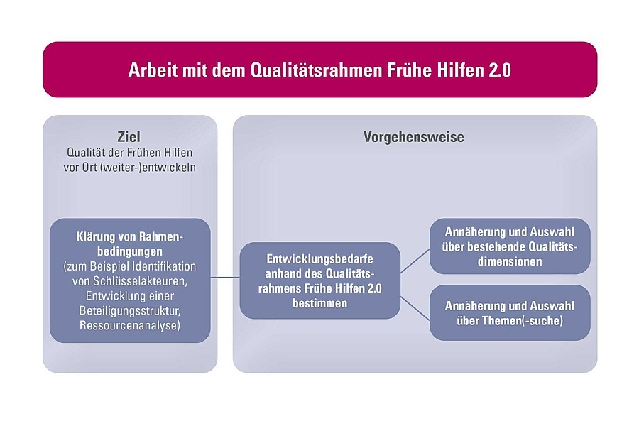 Zu Beginn eines jeden Qualitätsentwicklungsprozesses stehen das Ziel und die Bereitschaft, die Frühen Hilfen weiterzuentwickeln. Damit verknüpft ist auch die Verständigung der Akteure im Netzwerk über die Entwicklungsbedarfe Früher Hilfen vor Ort. Im Mittelpunkt steht somit, lokale und regionale Unterstützungssysteme mit koordinierten Hilfsangeboten für schwangere Frauen, werdende Eltern und Familien mit Kindern im Alter von 0 bis 3 Jahren zu bilden, weiterzuentwickeln und zu sichern.
