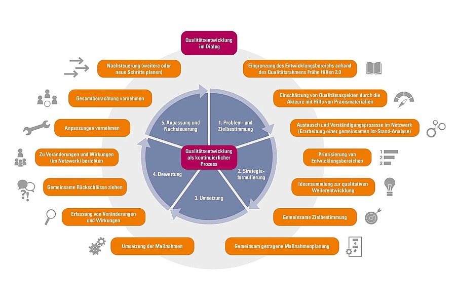 Die Qualitätsentwicklungsprozesse beschränken sich dabei nicht nur auf die Prozesse zur "Herstellung" bzw. Sicherstellung von Angeboten der Frühen Hilfen. Sie können ebenso Prozesse innerhalb des Netzwerks Frühe Hilfen betreffen sowie Auswirkungen auf persönlich-fachlicher Ebene haben, zum Beispiel als kontinuierliche Reflexion der persönlichen Haltung und Einstellungen in der eigenen Arbeit.