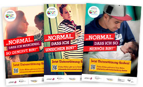 Mit dem Slogan "Jetzt Unterstützung finden" hat das NZFH Mütter und Väter in belasteten Lebenslagen angesprochen und motiviert, bei Problemen im Alltag Hilfe in Anspruch zu nehmen. In kostenlos erhältlichen Magazinen und auf Websites, die sich vor allem an Eltern kleiner Kinder wenden, führten QR-Code, Webadresse oder ein Direktlink auf die Website https://www.elternsein.info/unterstuetzung-finden/. Dort erhalten Eltern weiterhin Informationen über Frühe Hilfen in der Nähe sowie kostenlose und anonyme Beratungsangebote. Um Eltern mit dieser medialen Ansprache zu erreichen, hat das NZFH praxiserprobte Motive genutzt, die Situationen und typische Fragen von Müttern während der Schwangerschaft und von Müttern und Vätern mit kleinen Kindern aufgreifen: "Normal, dass ich so unsicher bin?", "Normal, dass ich so gestresst bin?" und "Normal, dass ich so genervt bin?"