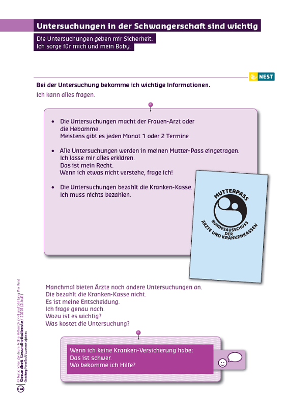 - Die Eltern erhalten Informationen über: Untersuchungen, die die Krankenkasse während der Schwangerschaft und danach im Rahmen der Mutterschaftsrichtlinien zahlt, die Früherkennungs-Untersuchungen für das Kind, zahnärztliche Untersuchungen, die Möglichkeiten zur Inanspruchnahme der Gesundheitsdienste in besonderen Situationen, z. B. wenn die Eltern nicht krankenversichert sind.