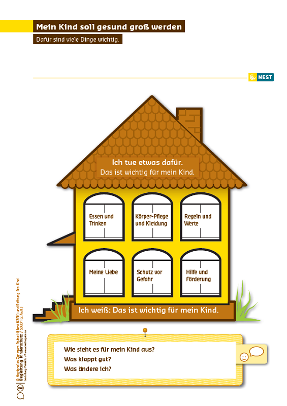 Das NEST-Material ermutigt die Fachkräfte, mit den Eltern frühzeitig und offen über die für den Kinderschutz notwendigen elterlichen Kompetenzen ins Gespräch zu kommen. Im Falle von Anhaltspunkten für Kindeswohlgefährdung helfen sie, die notwendigen Schritte zur Hilfe sachlich und klar zu besprechen.