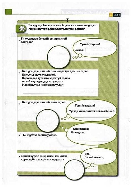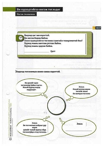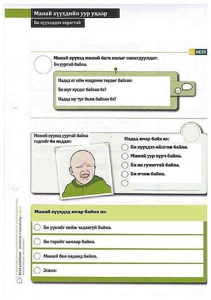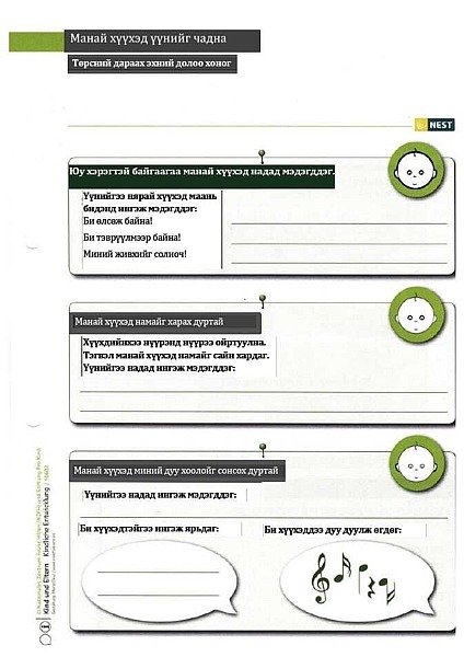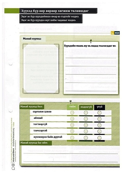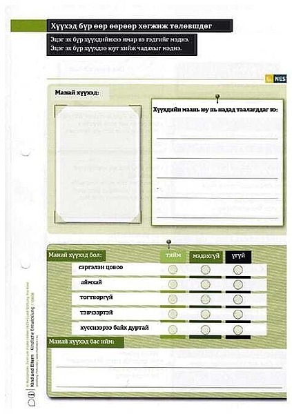 b) NEST Material für Frühe Hilfen: Dieses Material wurde vom Nationalen Zentrum Frühe Hilfen für den Einsatz in der Praxis entwickelt und dem Projekt freundlicherweise für eine Übersetzung zur Verfügung gestellt. NEST wurde speziell für die Arbeit der Fachkräfte der Frühen Hilfen mit Familien entwickelt und besteht aus farbigen Arbeitsblättern, welche die Fachkräfte mit den Familien durcharbeiten. Die Themen reichen generell von der Schwangerschaft bis zum zweiten Geburtstag. Die Inhalte berücksichtigen die besonderen Fragen und Themen der Familien, die in den Frühen Hilfen begleitet werden. Für den Einsatz in Ulaanbaatar wurden 24 teils doppelseitige Arbeitsblätter, die alle das erste Lebensjahr betreffen, ausgewählt, übersetzt und vervielfältigt.