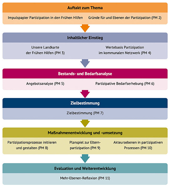 Die Praxismaterialien Partizipation von Familien orientieren sich an einem idealtypischen Verlauf, wie er im Projekt Frühe Hilfen qualitätvoll gestalten – Prozessbegleitung kommunaler Netzwerke erarbeitet wurde.