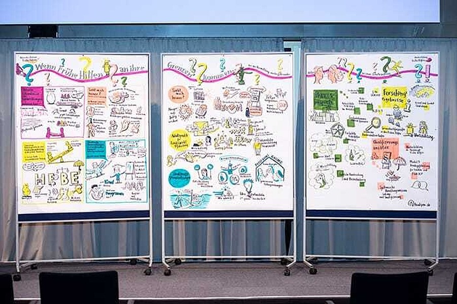 Wie lebendig die Konferenz verlief, zeigte am Ende auch die Darstellung des Konferenzverlaufs, den eine Konferenzmalerin vor Ort angefertigt hatte. Mechthild Paul hob darin die bildliche Darstellung der Kindesperspektive hervor. "Die Sicht des Kindes einnehmen" sei ein wichtiger und zentraler Aspekt der Arbeit in den Frühen Hilfen, so Paul.